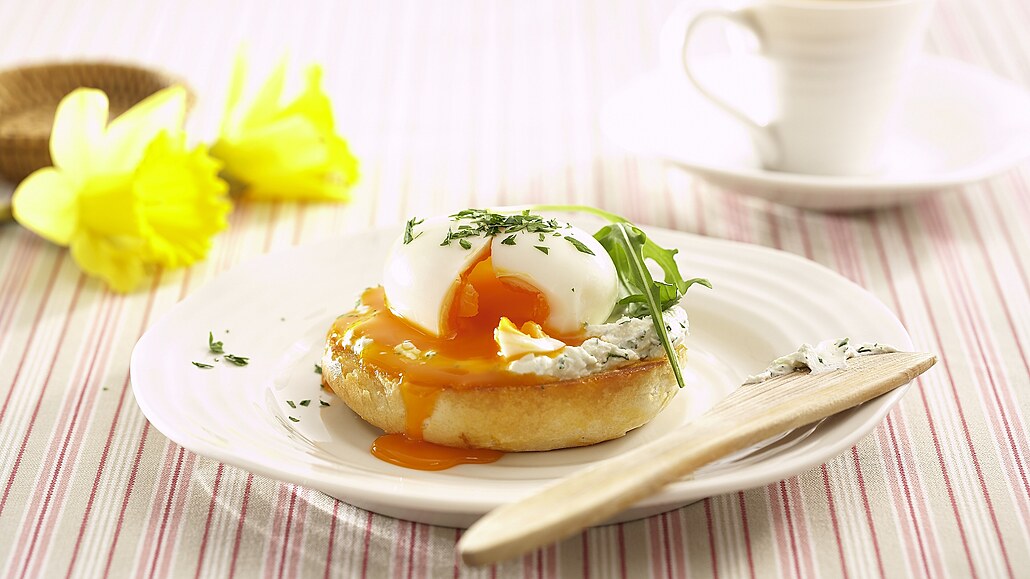 - V misce smícháme sýr se 3/4 bylinek. V kastrůlku přivedeme k varu vodu, osolíme ji. Do vařicí vody vložíme vejce a vaříme 5-7 minut. Ihned vložíme do studené vody a oloupeme.