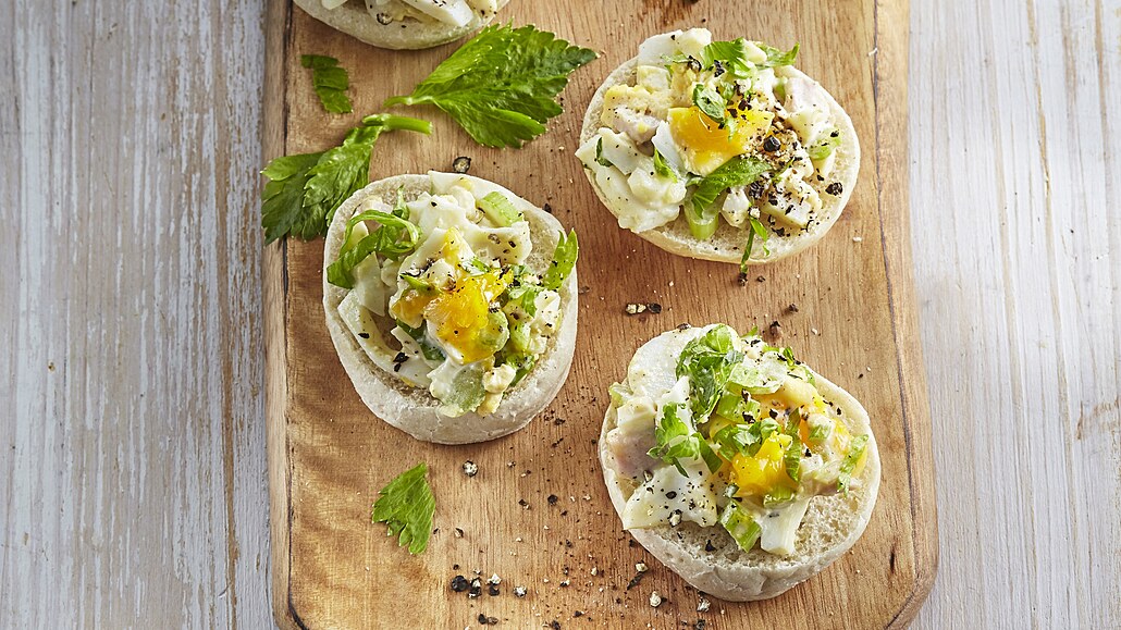 - Celer očistíme a nakrájíme na tenké nudličky, spaříme je v osolené vodě, propláchneme studenou vodou a necháme okapat. Listy řapíkatého celeru a jarní cibulku nakrájíme na velmi jemné kousky.