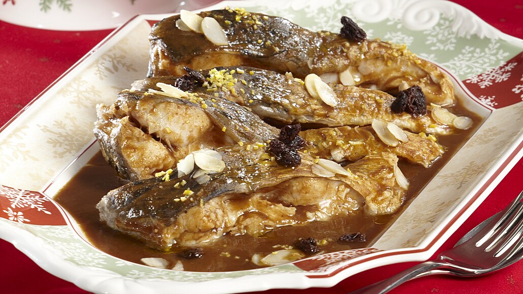 - Rybu vyndáme na mísu. Do omáčky přidáme povidla a zahustíme ji nastrouhaným perníkem. Vše rozmícháme, do omáčky ještě přidáme rozinky, sladké mandle a citronovou kůru a přelijeme jí porce ryby. Podáváme s bramborovými noky.