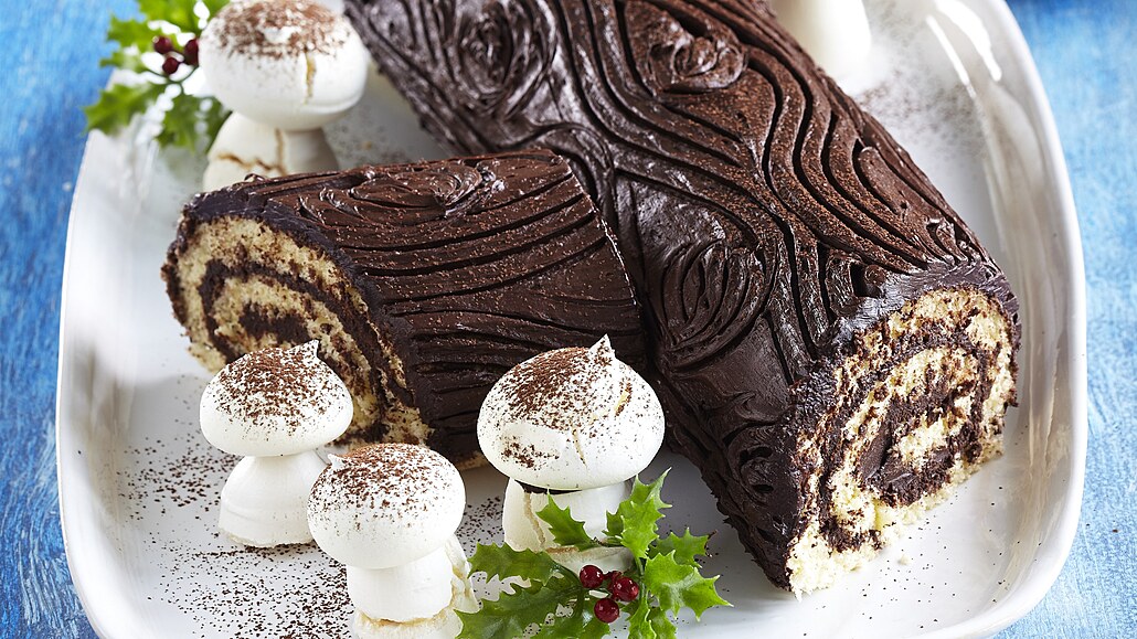 - Z rolády odkrojíme šikmo malou část a přitiskneme ji ze strany jako větev. Nakonec dozdobíme houbičkami a lehce posypeme kakaem.