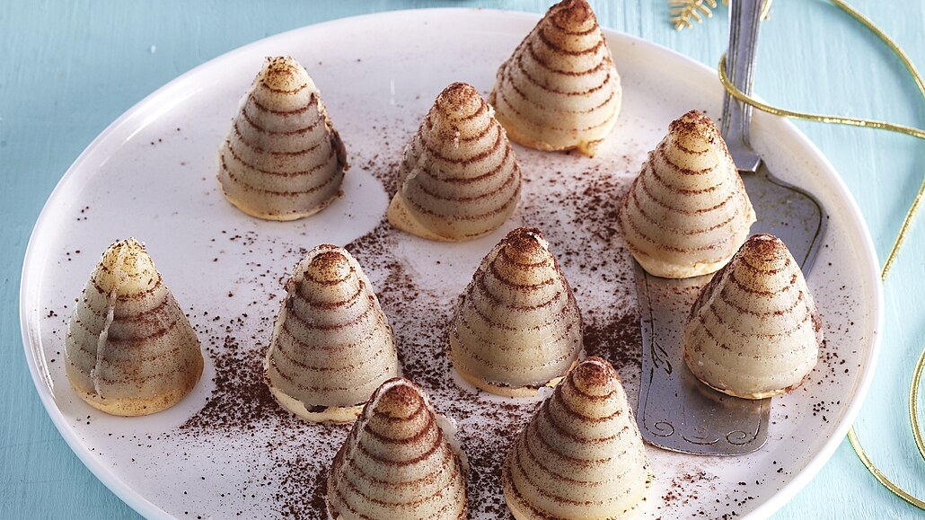 - Pak vložíme těsto, pomocí konce vařečky vytvoříme důlek, který naplníme krémem a přiklopíme piškotem. Formičku opatrně odstraníme a posypeme kakaem.