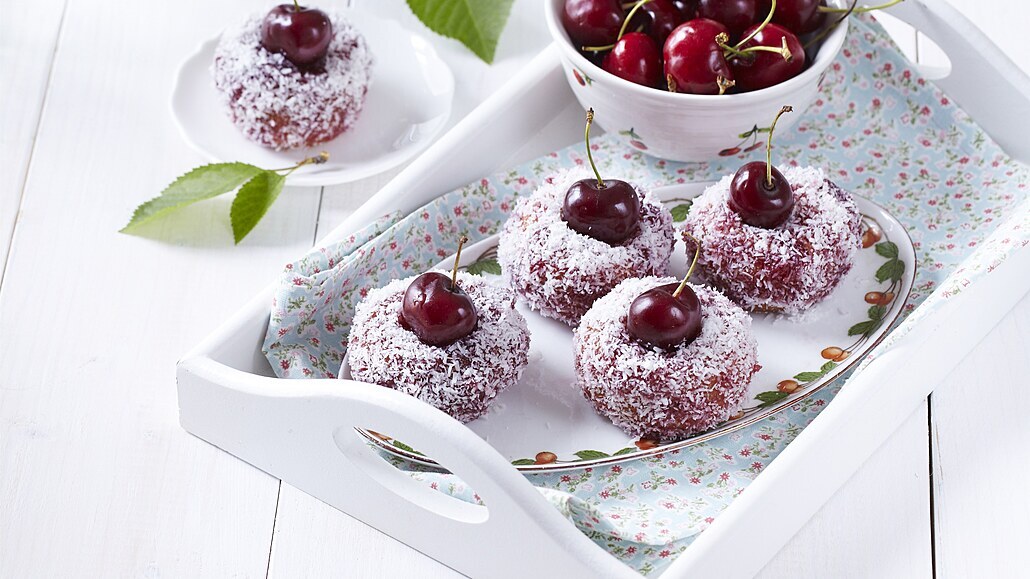 - Vdolečky namočíme do nahřátého džemu a obalíme v kokosu. Podáváme je dozdobené omytými třešněmi.