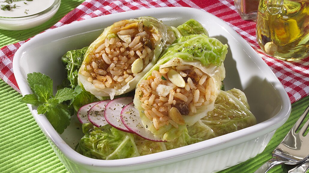 - Zapékací misku vytřeme máslem nebo olejem. Kapustu rozebereme na jednotlivé listy a krátce blanšírujeme ve vroucí vodě, až jsou měkké a ohebné. Scedíme a vyřízneme tuhá žebra. Ve větším kastrůlku rozehřejeme olej, přidáme najemno nakrájenou jarní cibulku, oloupaný a prolisovaný česnek a krátce orestujeme. Přidáme rajčatový protlak, rozinky, mandle, kmín, skořici, petrželku a rýži a vše dobře promícháme. Odstavíme a necháme trochu zchladnout.