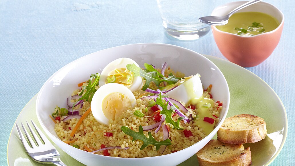 - Nakonec kuskus lehce promícháme s rukolou a společně s rozkrojenými vejci rozdělíme na talíře. Doplníme dresinkem a můžeme přidat i opečené tousty.