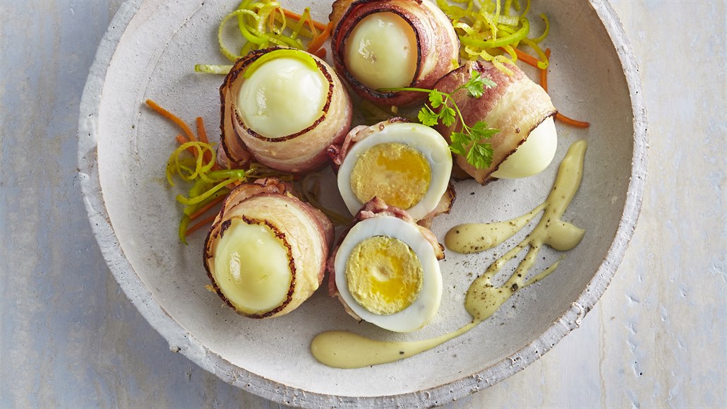 - Mezitím uvaříme všechna vejce natvrdo, zchladíme je ve studené vodě a oloupeme. Každé vejce zabalíme do plátku anglické slaniny.