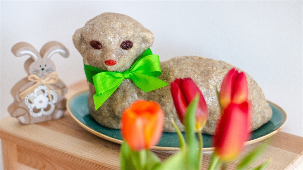 - Před servírováním beránka vyklopíme z formy, postavíme na talíř, z rozinek a goji vytvoříme oči a čumáček. Okolo krku mu uvážeme mašli.