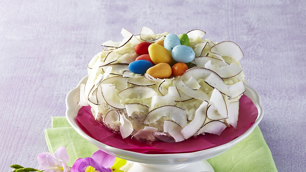 - Čokoládu rozlámeme na malé kousky a rozpustíme na horké vodní lázni. Pak vmícháme máslo, smetanu a mícháme, dokud se vše nespojí v hladkou hmotu. Odstavíme a necháme vychladnout. Pak vyšleháme metličkou na hladký krém a potřeme jím celý věnec. Nakonec ho posypeme hoblinkami kokosu a dozdobíme cukrovými vajíčky.