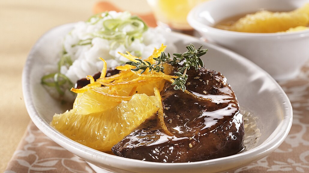 - Játra vyndáme z mléka, necháme okapat a obalíme v hladké mouce. Pak je opečeme na oleji, přilijeme omáčku, přidáme filátka z pomeranče a dusíme doměkka. Podáváme s rýží.