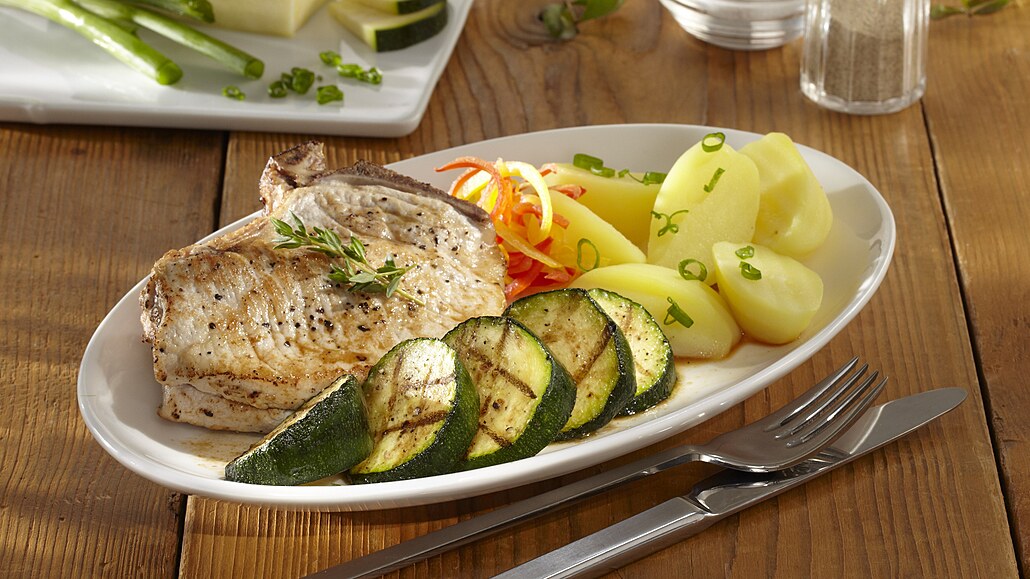 - Mezitím očistíme cukety. Nakrájíme je na plátky, potřeme prolisovaným česnekem, osolíme a opepříme. Grilovací pánev vytřeme olejem a cuketu na ní z obou stran pomalu opečeme. Maso i cuketu rozdělíme na talíře a podlijeme šťávou. Podáváme s vařenými brambory. Můžeme zdobit tymiánem.