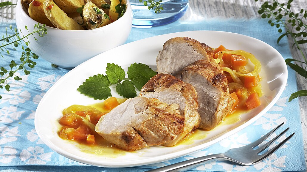 - Do výpeku vsypeme mrkev s paprikami a orestujeme je. Podlijeme je zbylou marinádou a džusem, osolíme, opepříme a jen krátce podusíme. Nakonec šťávu zahustíme škrobem rozmíchaným v troše vody.