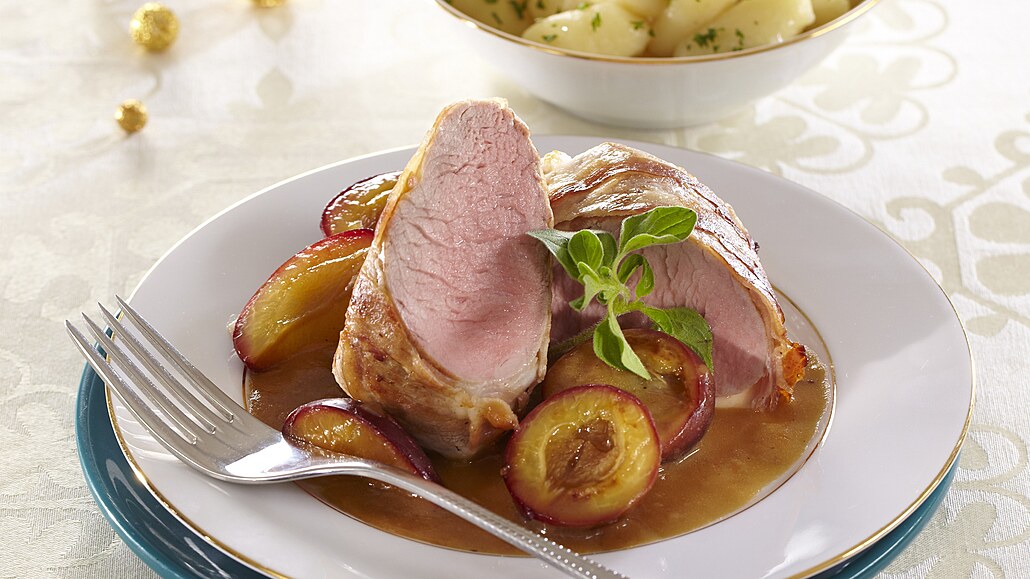 Kombinace opečené pancetty, švestkové omáčky a bramborových noků je naprosto dokonalá.