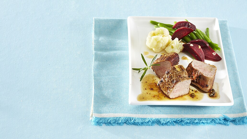 - Maso nakrájíme na špalíky a i s vypečenou šťávou je rozdělíme na talíře. Obložíme je zeleninou, kterou pak pokapeme rozpuštěným máslem a posypeme mandlemi. Pokrm ozobíme lístky ze zbylé snítky rozmarýnu.