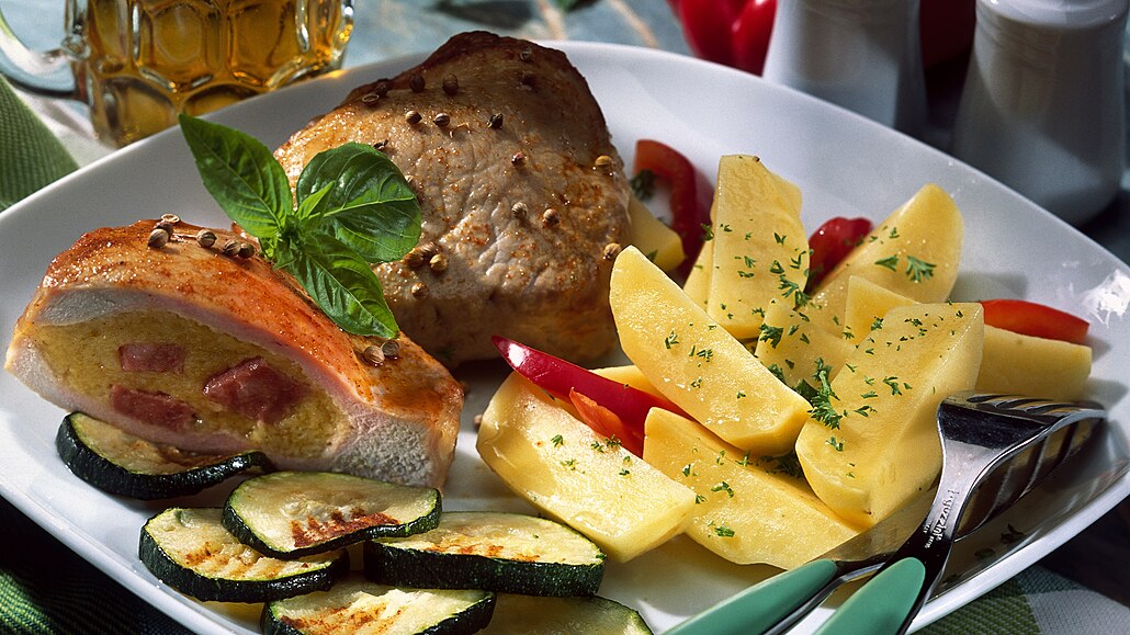 - Cuketu nakrájíme na kolečka a na lžíci oleje opečeme, lehce osolíme. Měkké kotlety podáváme s vařenými bramborami s petrželkou, opečenou cuketou, čerstvými rajčaty a čerstvou bazalkou.
