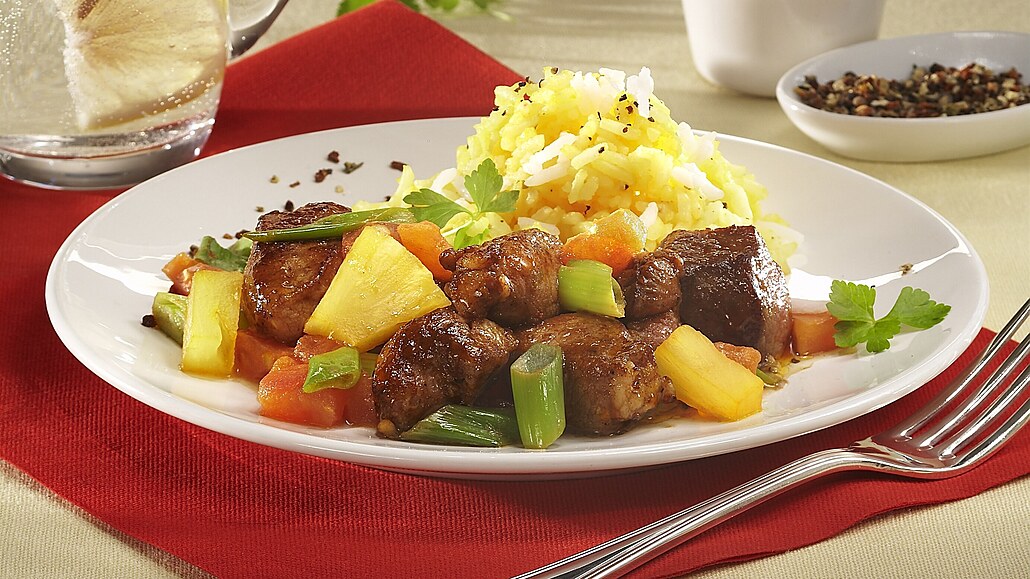 - V pánvi rozpálíme olej a maso i s marinádou na něm orestujeme. Osolíme, opepříme a ochutíme octem. Pak přidáme jarní cibulku, rajče a zázvor. Vše podusíme a nakonec vmícháme kousky ananasu. Vepřové kostky se zeleninou rozdělíme na talíře a ozdobíme petrželkou. Jako přílohu podáváme rýži.