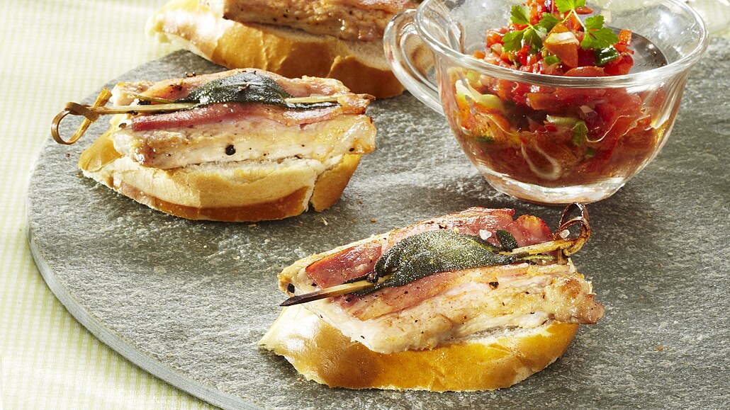 - Plátky masa osolíme a opepříme. Na každý položíme plátek slaniny a lísteček šalvěje. Vše upevníme párátky.