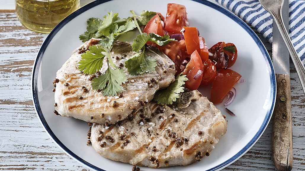 Grilované kotlety získají díky koriandru zajímavou chuť i vůni. Když je doplníte salátem z rajčat, máte dokonalý letní oběd nebo večeři.