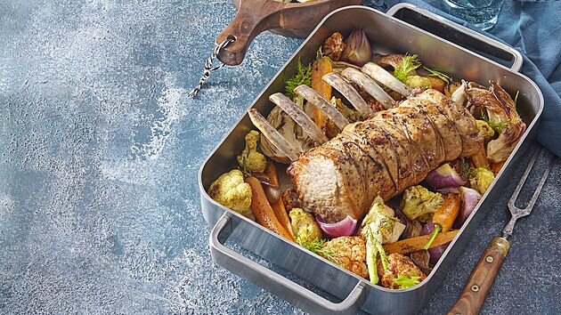 - Kotlety očistíme od kostí a celý kus masa osolíme a opepříme. Maso můžeme upevnit omotáním motouzu. Na trošce oleje ho pak opečeme do hněda ze všech stran a vyndáme do pekáčku.