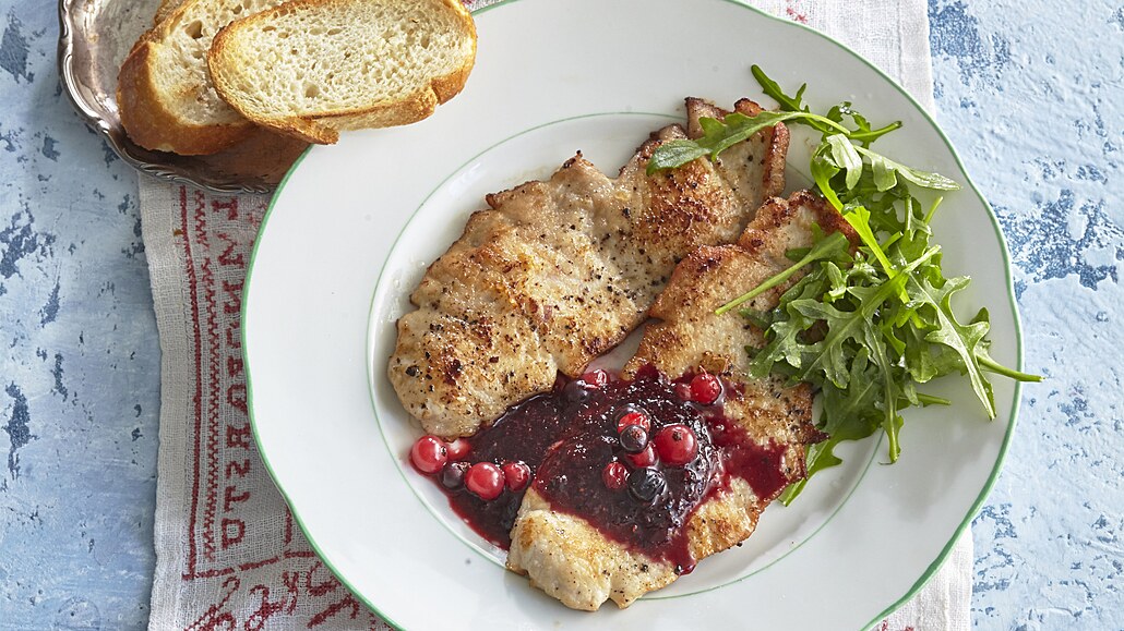 - Do výpeku přidáme lžíci hladké mouky, zamícháme, zalijeme několika lžícemi vody. Přidáme bílé víno, které necháme krátce odpařit. Omáčku metličkou prošleháme a povaříme, dokud mírně nezhouste. Vmícháme rozmixované ovoce, prohřejeme a podle chuti osolíme a opepříme. Podávat můžeme s plátky dokřupava opečené bagety a zeleninovým salátem.