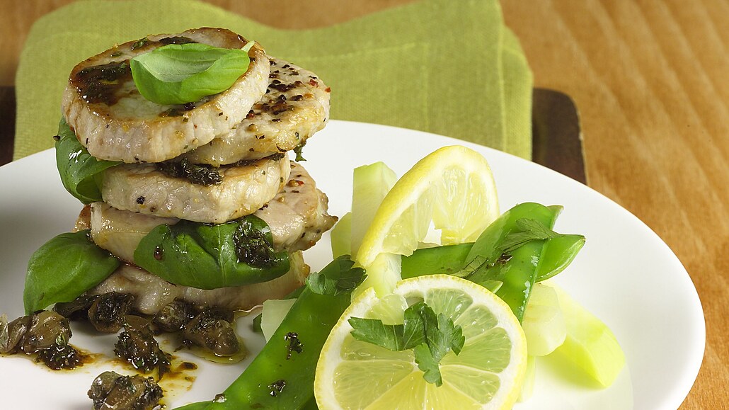 - Maso nakrájíme na medailonky, lehce naklepeme, osolíme, opepříme, pokapeme olejem a necháme odležet. Petržel a polovinu bazalky pokrájíme, smícháme s polovinou oleje a posekanými kapary.