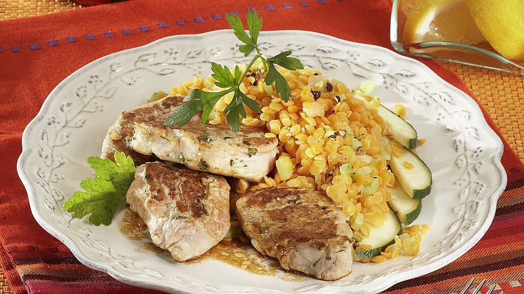 - Vepřové medailonky zprudka opečeme na rozehřátém oleji na pánvi. Pak je osolíme a zvolna dopečeme. Upečené plátky masa přendáme na talíř a uchováme teplé. Výpek rozředíme vývarem a dochutíme rajským protlakem a sójovou omáčkou. Plátky masa rozdělíme na talíře a doplníme dušenou čočkou. Jednotlivé porce dozdobíme čerstvou petrželkou a několika plátky čerstvé křehké cukety.