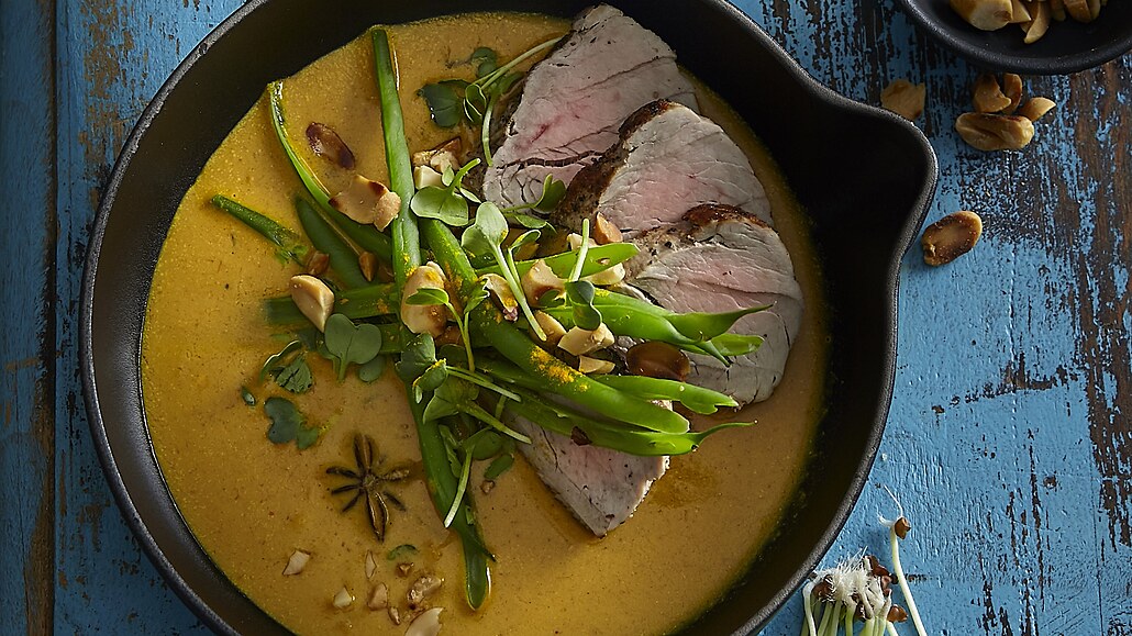 - V hrnci rozhřejeme olej a maso na něm osmahneme ze všech stran, dokud se nezatáhne. Pak ho vyjmeme z pánve, vložíme do ní kari pastu a restujeme, až se rozvoní. Přilijeme mléko, kokosovou vodu, rybí omáčku, badyán, kafírové listy a roztlučený stonek citronové trávy.