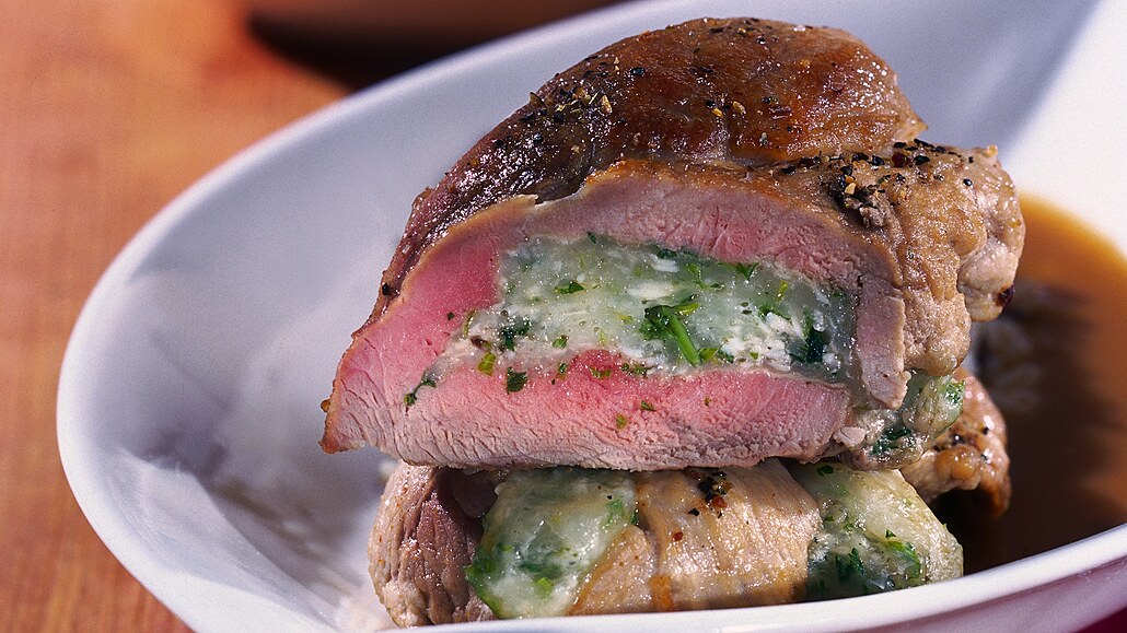 - Takto naplněné řízky obalíme v mouce. Na oleji osmažíme nadrobno nakrájenou cibulku, položíme na ni připravené plněné řízky, na povrchu posypeme mletou paprikou, podlijeme horkou vodou a dáme přikryjeme pokličkou dusit do trouby asi na 10 minut. Pak pokličku sundáme a pečeme při teplotě 190 °C doměkka. Hotové řízky podáváme s rýží podlité šťávou z výpeku.