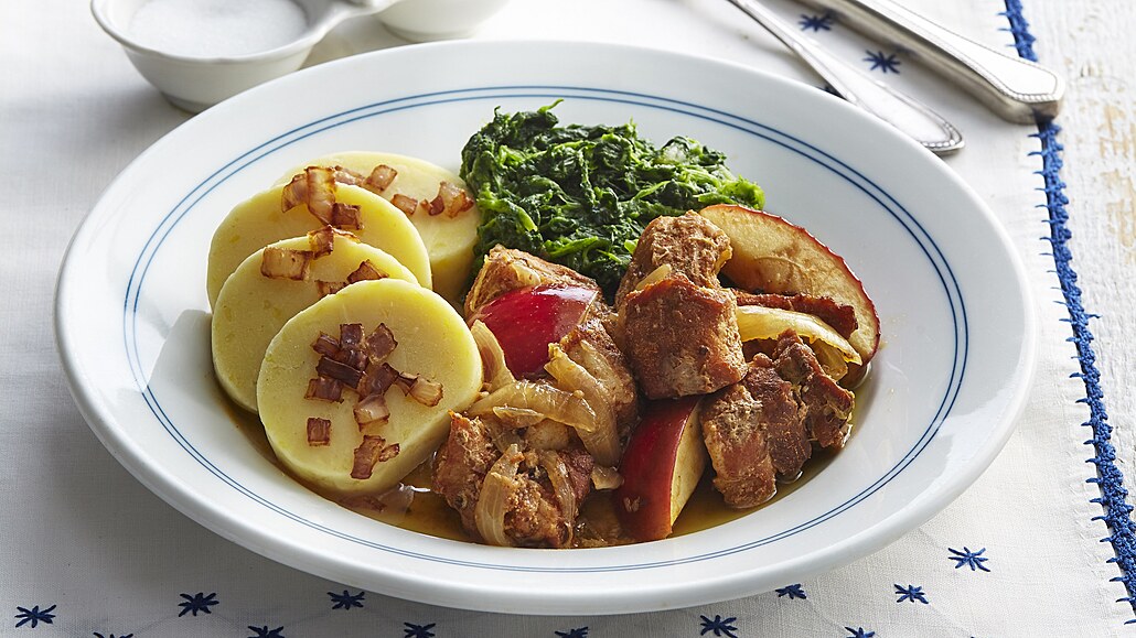 - Poté maso podlijeme pivem a pečeme dalších 60 minut. Občas promícháme. 20 minut před koncem pečení přidáme k masu na větší kusy nakrájená jablka bez jádřinců. Hotové můžeme podávat třeba se špenátem a bramborovým knedlíkem.