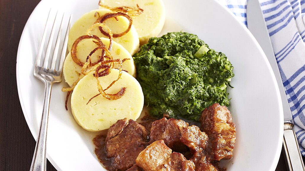 - Na oleji orestujeme na jemno nasekanou cibuli s česnekem. Zalijeme smetanou a necháme ji svařit. Pak přidáme rozmrazený špenát a ochutíme jej solí i pepřem. Krátce vše povaříme a necháme zchladnout. Výpečky podáváme se špenátem a bramborovým knedlíkem posypaným osmaženou cibulkou.