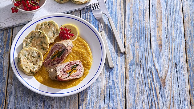 - Závitky i koření vyjmeme, maso zakryté udržujeme v teple a omáčku rozmixujeme, popřípadě ještě protřeme přes síto. Nakonec omáčku zjemníme smetanou, dochutíme citronem a plátkem másla, prohřejeme, ale již nevaříme. Závitky zbavíme párátek, rozkrojíme a podáváme s omáčkou, doplněné například karlovarským knedlíkem, kouskem biocitronu a rybízem, popřípadě brusinkami.