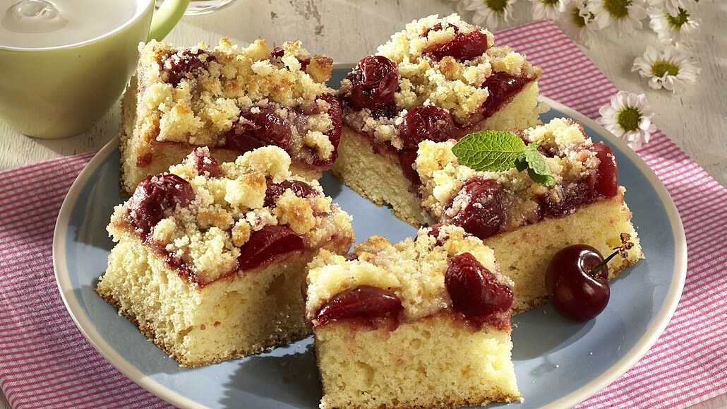 - Višně opláchneme a necháme okapat. Poté je odstopkujeme a vypeckujeme. Z hrubé mouky, tuku a moučkového cukru připravíme drobenku.