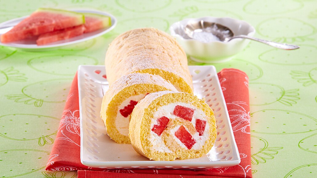 Lehký ovocný dezert sází na nadýchaný piškotový korpus a hedvábnou náplň z tvarohu a šlehačky provoněnou vanilkou. Kousky šťavnatého melounu ukryté v roládě zajišťuje moučníku nevídanou vláčnost a barevnost na řezu, čímž vzniká vizuálně atraktivní kousek, který po jemném pocukrování projasní každé vaše letní posezení.