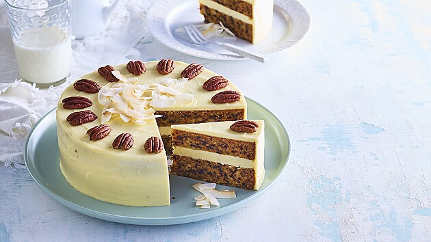 - Pak do něj po částech zašleháme krémový sýr a mascarpone. Polovinou krému slepíme oba pláty k sobě a zbytkem krému dort pomažeme ze všech stran a uhladíme stěrkou. Můžeme ještě dozdobit půlkami pekanů a opraženými kokosovými chipsy.