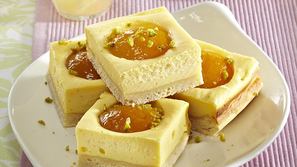 - Těsto rozválíme na obdélníkový plát o rozměrech 30x40 cm a vložíme do vymaštěného a vysypaného pekáčku. Rozetřeme na něj tvarohovou náplň a rozložíme půlky meruněk. Koláč vložíme do předehřáté trouby. Při 170 °C ho pečeme asi 40 minut. Nakonec koláč posypeme sekanými pistáciemi.