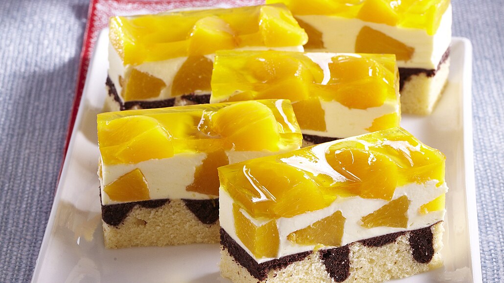 - Polovinu krému rozetřeme na vychladlý korpus a rozložíme polovinu broskví nakrájených na dílky. Pak rozetřeme na povrch zbylý krém a rozložíme zbylé nakrájené broskve. Dáme do chladničky ztuhnout. Po ztuhnutí přelijeme dortovým želé, které připravíme podle návodu na obalu, necháme ztuhnout a nakrájíme na porce.