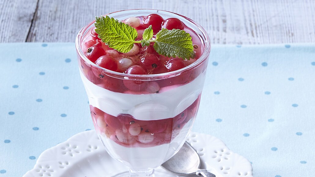 - Na ztuhlé želé rozdělíme zbylý krém, poklademe druhou polovinou rybízu a zalijeme ho želé. Necháme zatuhnout v chladničce asi 60 minut. Před podáváním můžeme poháry dozdobit mátou nebo rybízem.