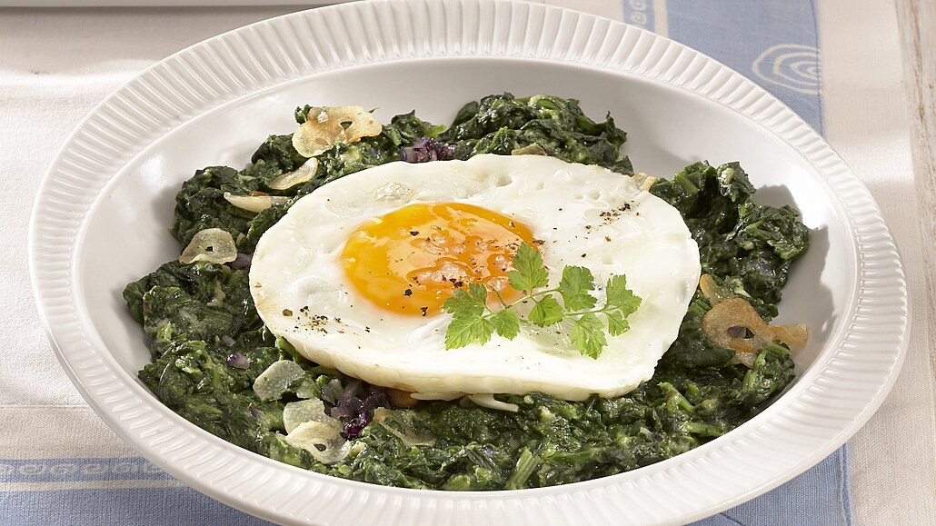 - Mističky lívanečníku potřeme olejem a zahřejeme. Do každé opatrně rozklepneme vejce, opepříme je a pečeme, dokud bílky neztuhnou. Špenát rozdělíme na talíře, přidáme volské oko (sázené vejce) a posypeme bylinkami. Můžeme podávat s opečenou bagetou.