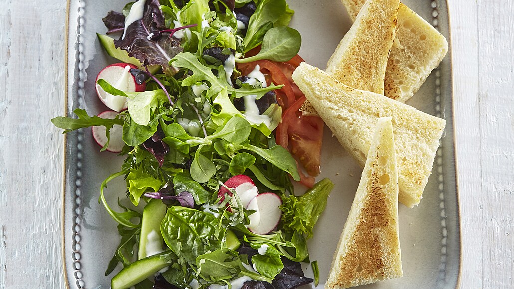 - Okurku, rajčata a ředkvičky nakrájíme dle libosti, smícháme je s mixem listových salátů a zalijeme připraveným dresinkem. Salát můžeme podávat třeba s opečeným toastovým chlebem.