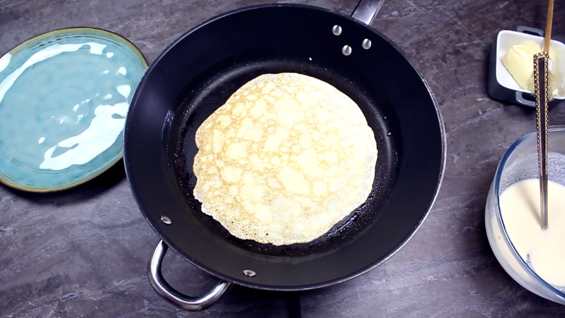 - Když je pánev dostatečně rozpálená, nalijeme na pánev jednu naběračku těsta. Ihned s pánví začneme otáčet, aby se těsto rovnoměrně rozprostřelo po celém dně pánve.