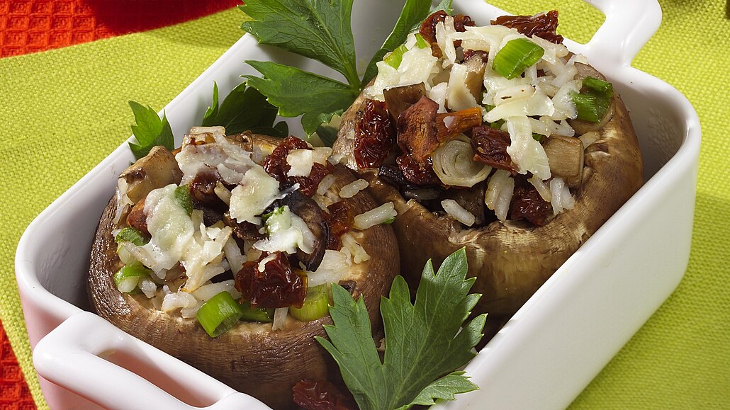 - Houby nasypeme do misky, přidáme uvařenou rýži, nasekanou jarní cibulku, osolíme, opepříme a touto směsí naplníme kloboučky žampionů.