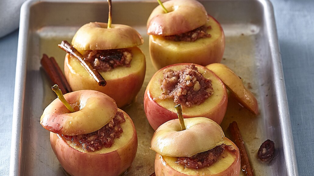 - Jablka pečeme ve vyhřáté troubě na 180 °C asi 40 minut. Hotová jablka podáváme teplá.