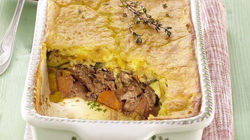 - Zapékací mísu vytřeme máslem a naplníme směsí z pánve. Přidáme pokrájenou cuketu a vše zakryjeme bramborovým pyré. Játra zapékáme v troubě při 200 °C asi 30 minut.
