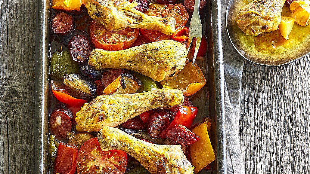- Kuřecí paličky omyjeme, osolíme a opepříme. Papriku nakrájíme na větší kousky, rajčata a česnek rozkrojíme podélně na půl. Klobásu na kolečka a vše vložíme do pekáče vymazaného olivovým olejem.