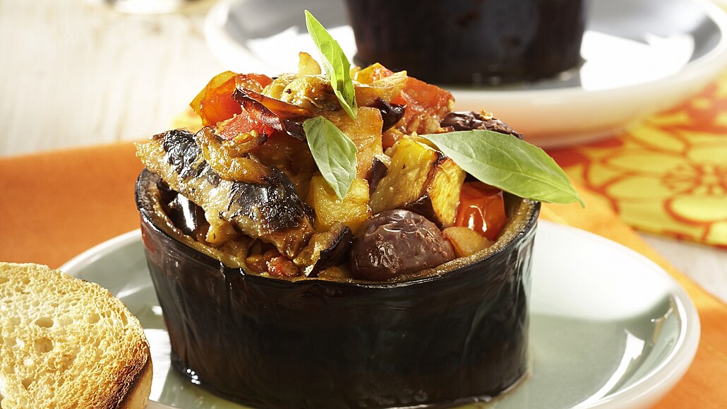 - Vyříznutou dužinu lilku nakrájíme najemno. Česnek oloupeme, stroužky překrájíme na větší kousky. Lilek s česnekem a omytá rajčátka krátce orestujeme na zbylém oleji. Vmícháme rozmixované olivy, přidáme ančovičky a podlijeme vínem. Podusíme, zahustíme strouhankou a dochutíme petrželkou. Směsí naplníme orestované lilky, které zapékáme v troubě při 180 °C asi 25 minut do zhnědnutí. Ozdobíme bylinkami a podáváme, nejlépe s toasty.