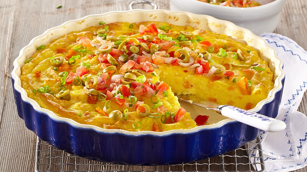 - Polentu vlijeme do vymaštěné zapékací mísy a uhladíme ji. V troubě ji při 190 °C zapékáme asi 30 minut.