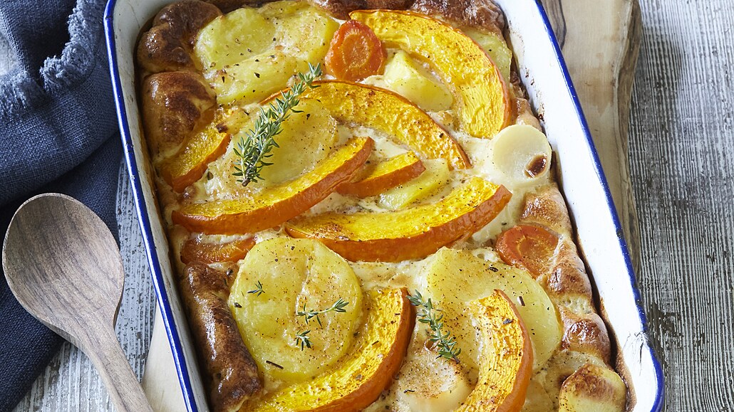 - Pekáček vytřeme máslem a postupně vrstvíme nakrájenou zeleninu společně s dýni, nasekanou cibulí a česnekem. Vrstvy průběžně ochutíme solí, pepřem a oreganem.