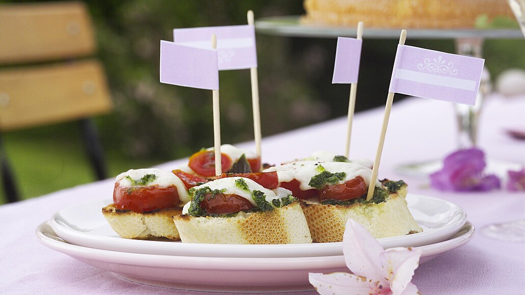 - Chlebíčky zapečeme pod rozehřátým grilem po dobu 3 minut, až se sýr částečně rozpustí. Hotové opepříme, osolíme, povrch pokapeme pestem a ozdobíme bazalkou.