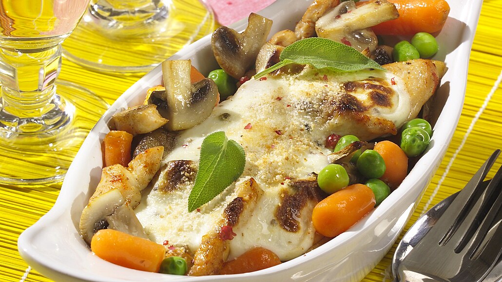 - Do zapékací mísy naskládáme připravené maso, zaprášíme mletou paprikou, přidáme ortestované žampiony, zeleninu a zalijeme bílou omáčkou. Vložíme do trouby a zapečeme 15 až 20 minut při 190 °C. Hotové ragú posypeme čerstvě mletým pepřem a podáváme.