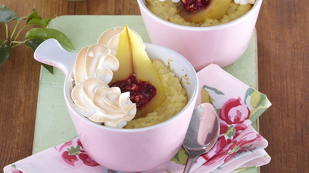 - Z bílku, cukru a citronové šťávy ušleháme pevný sníh. Ozdobně ho nastříkáme na zapečené hrušky. Misky vložíme do vyhřáté trouby a dopečeme při 180 °C asi na 10 minut, až sníh zrůžoví. Podáváme teplé.