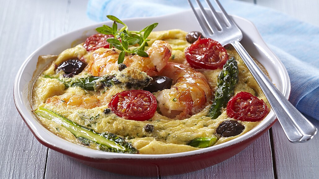 - Zapékací formu vymažeme olejem. Krevety omyjeme a dáme do mísy, přidáme chřest, olivy a rozpůlená rajčátka. Vše zlehka promícháme, dáme do zapékací formy a zalijeme smetanovou směsí. Povrch poklademe hoblinkami másla.