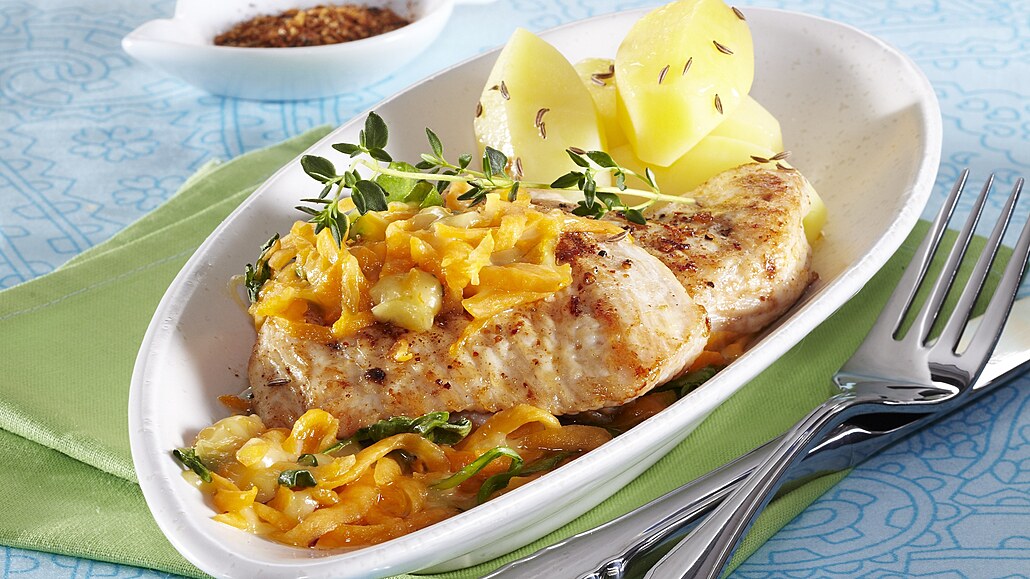 - Zapékací formu vymažeme olejem, naplníme polovinou dýňové směsi, poklademe krůtími prsíčky a shora překryjeme druhou polovinou směsi. Vložíme do vyhřáté trouby a pečeme asi 40 minut při 180 °C. Podáváme s bramborami.